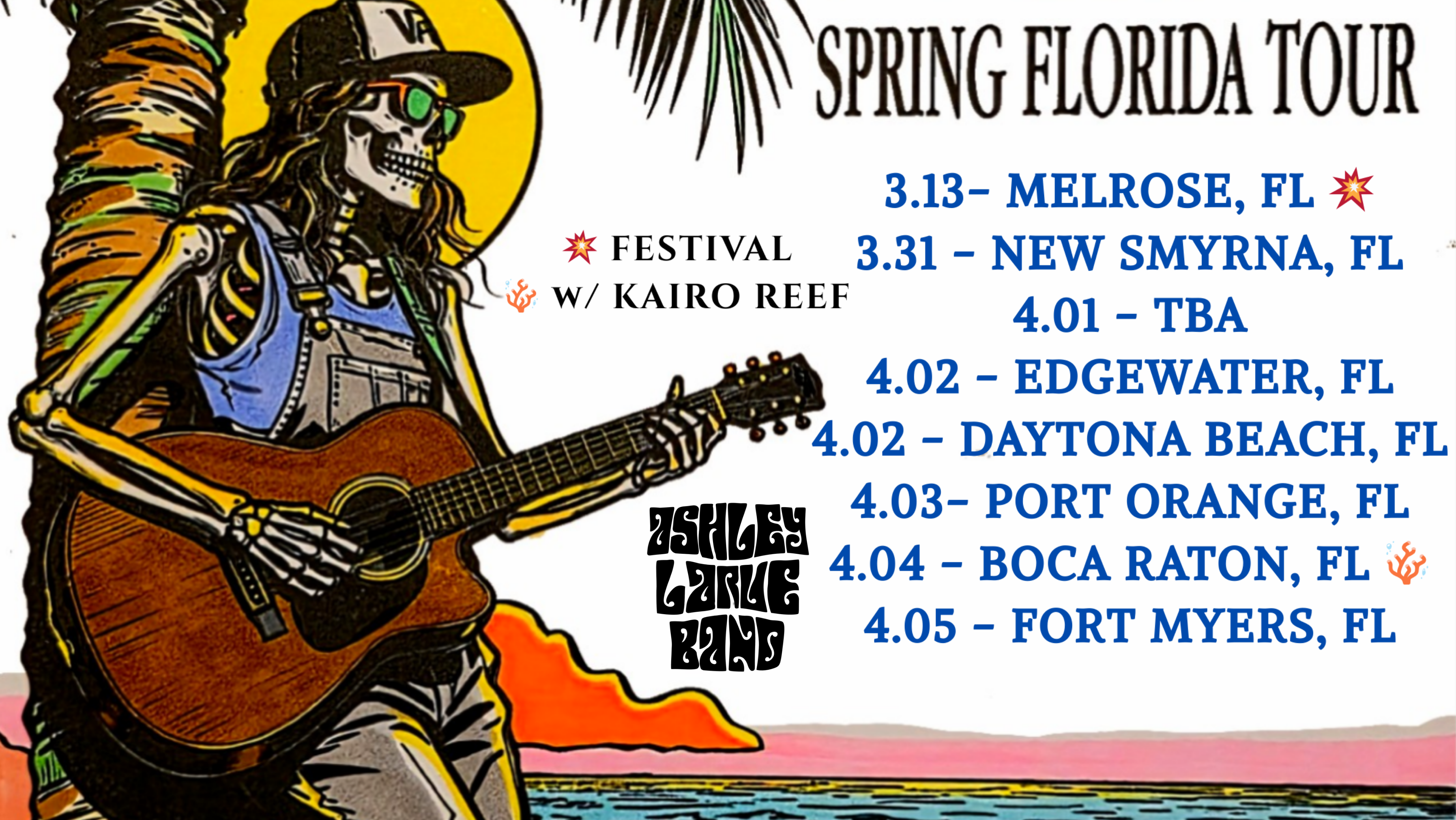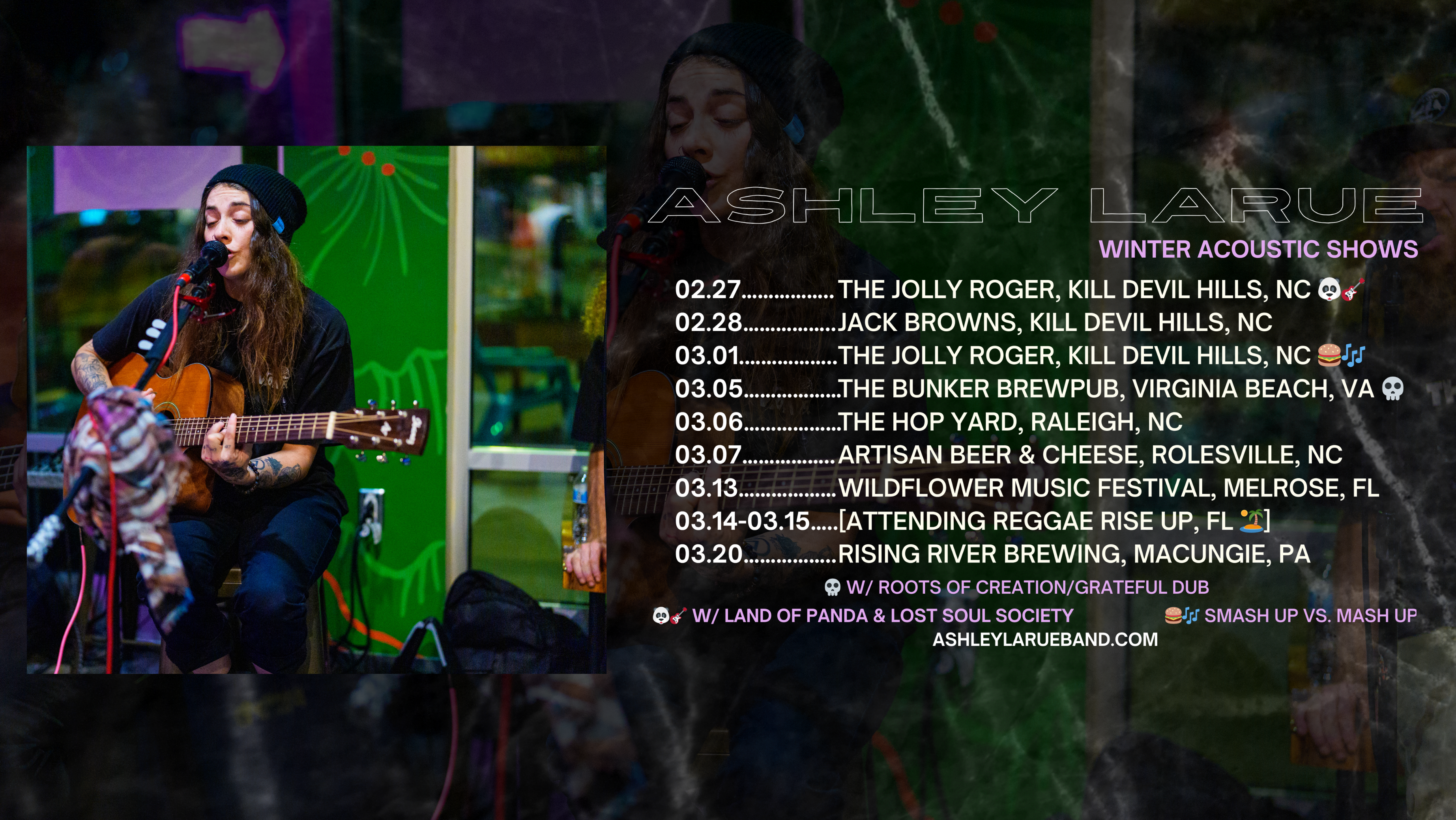 A fine blend of acoustic, reggae, alt rock, and what can only be described as "her sound", Ashley LaRue and her band reach out to the world with messages of positivity, hope, and good vibes as a bonded tribe of musical virtuosos. ALB is currently working on their Debut LP with record producer Eddie Ashworth, at The Oxide Shed in Athens, OH. The LP is set to release Spring 2026!